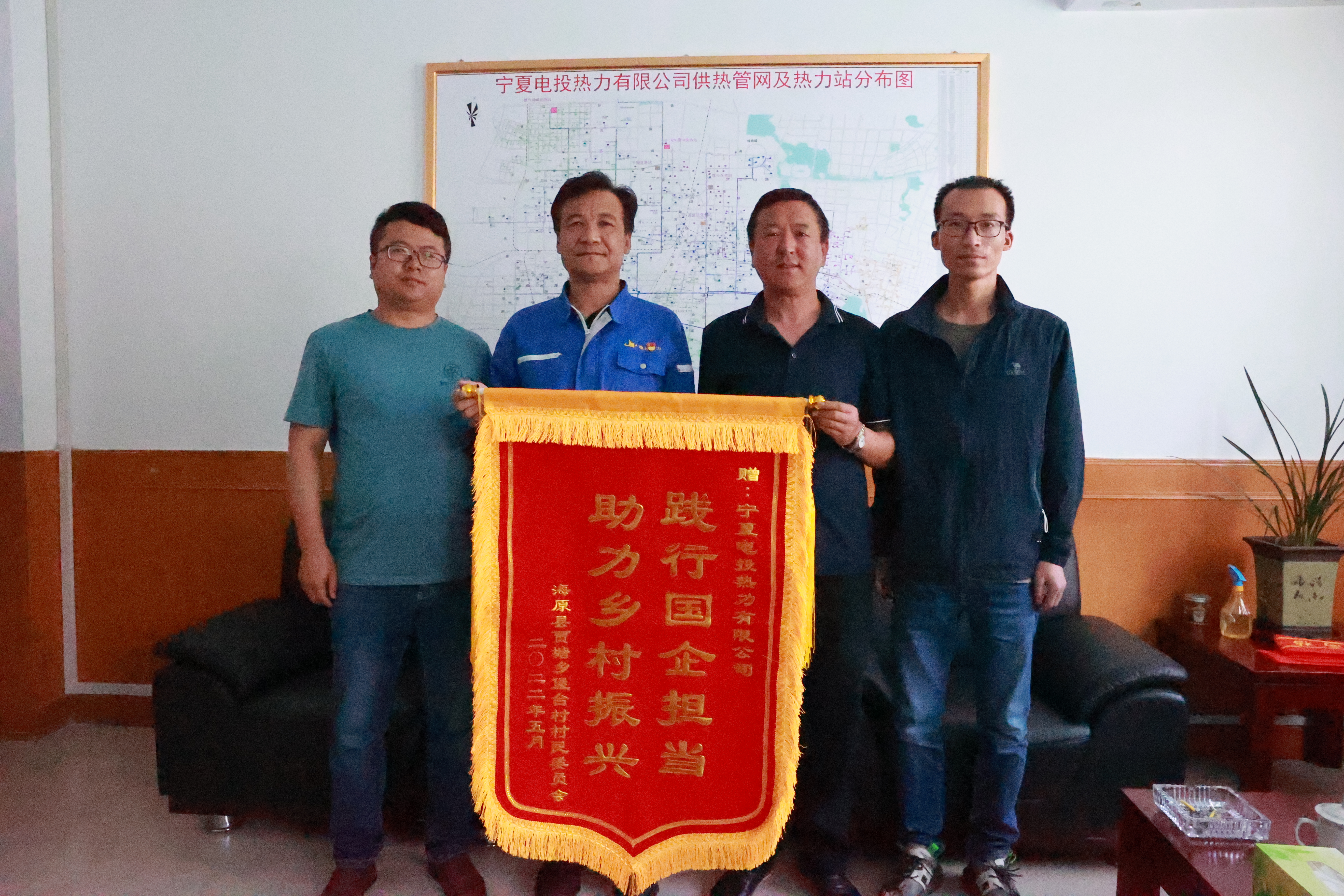 5月26日,海原縣賈塘鄉(xiāng)黨委組織部長李世民一行代表全體村民為熱力公司送來一面繡有“踐行國企擔(dān)當(dāng) 助力鄉(xiāng)村振興”的錦旗,充分肯定了駐村工作隊(duì)的工作成績和辛勤付出,深情感謝熱力公司對鄉(xiāng)村振興工作的大力支持。