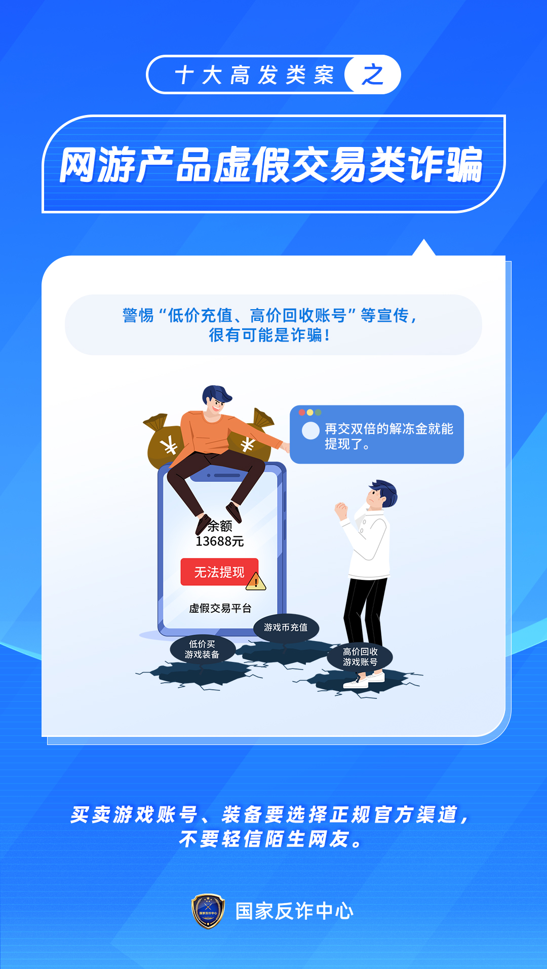 十大高發(fā)類案之網(wǎng)游產(chǎn)品虛假交易類詐騙 發(fā)布時間:2023年07月04日 08時55分 作者:管理員 來源:本站 上一條:十大高發(fā)類案之冒充領(lǐng)導、熟人類詐騙下一條:十大高發(fā)類案之婚戀、交友類詐騙